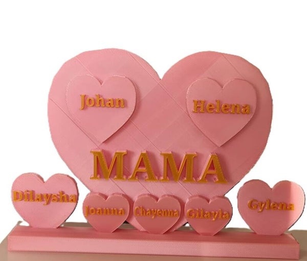 Deze 3D-geprinte hartdecoratie is speciaal ontworpen voor moeders en laat zien hoeveel ze betekent. Het grote hart met de tekst MAMA wordt omringd door kleinere hartjes met de namen van dierbaren – volledig gepersonaliseerd.